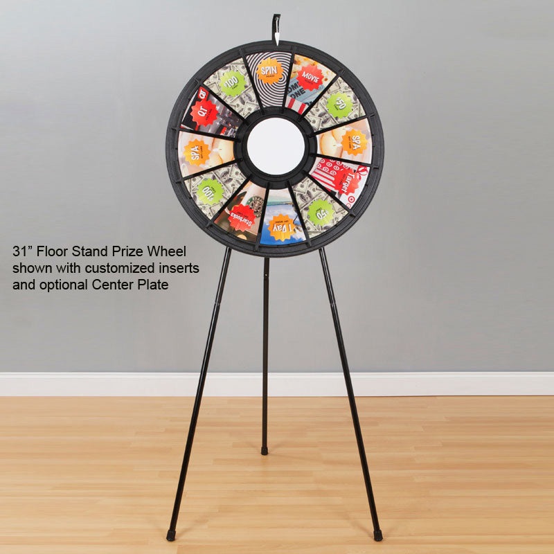 Features31" diameter Floor Stand Prize Wheel creates an authentic, casino-type atmosphere.Spring-pin legs with rubber feet create an impressive unit over 6' tall.Legs remove easily in seconds, converting the unit for tabletop use.12-slot design provides am