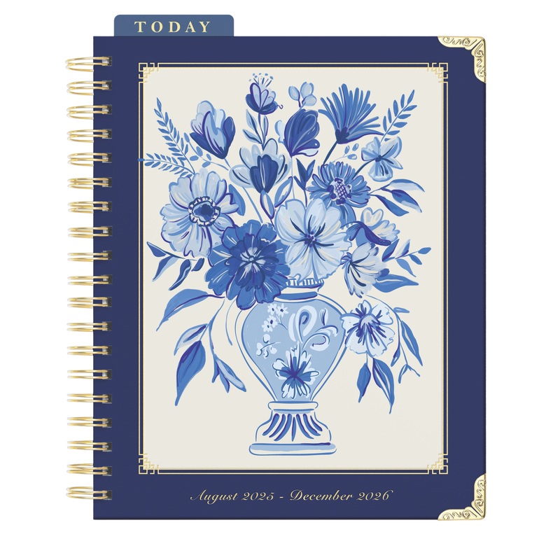 Our spiral planners showcase elegant illustrations enhanced with gold foil details and a gold wire binding. Available for pre-order with shipping starting June 2025. The hardcover planner measures 8″ x 10″ and includes monthly and weekly layouts from August 2025 through December 2026. Features include gold foil and metal square corners on the cover, a two-year calendar with holiday highlights, multiple informational and contact pages, tabbed dividers for easy navigation, and a foil-stamped sticker sheet stored in an interior pocket.