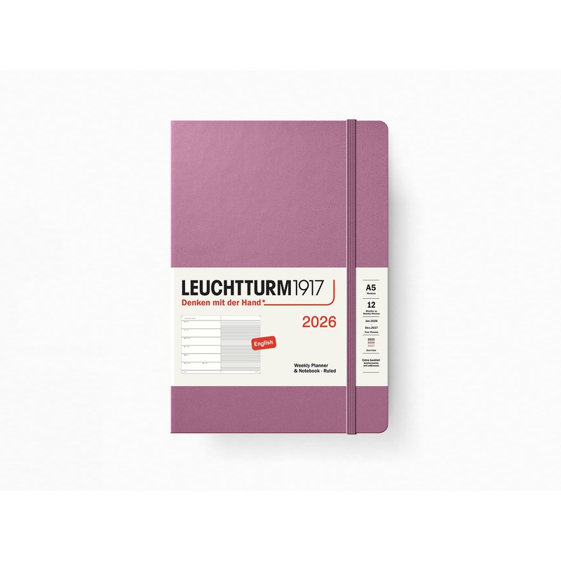 Weekly Planner and Notebook 2026Every double page features a page with the calendar week on the left and a ruled notebook page on the right. With all overviews and features you would expect.Composition B5 measures 7" x 10" | 178 x 254 mmMedium A5 measures