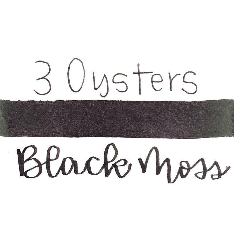 This 3 Oysters Delicious Black Moss fountain pen ink offers an exquisite dark green-black color with a distinctive black sheen. The ink has an average flow and fast drying time of 30 seconds in a medium nib on Rhodia paper, making it ideal for writing proj
