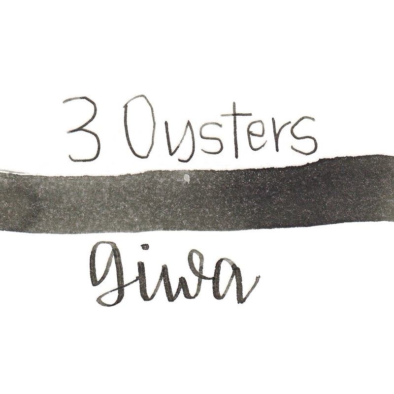 The 3 Oysters I.COLOR.U Giwa fountain pen ink is a dark green-black ink with low shading and low black sheen. It has a dry flow and dries in 40 seconds in a medium nib on Rhodia paper. It is packaged in a glass bottle with a special cut-out corner for easy