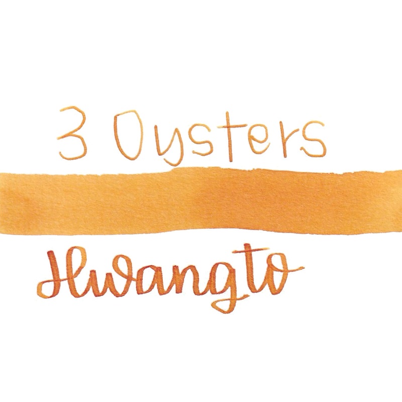 3 Oysters Hwangto from the I.Color.U collection is a medium tangerine orange fountain pen ink ink with medium shading and low orange sheen. It dries in 40 seconds in a medium nib on Rhodia and has a dry flow. The glass bottle has a cut out corner to lean the bottle for a decorative display. 3 Oyster ink is made in Korea.
