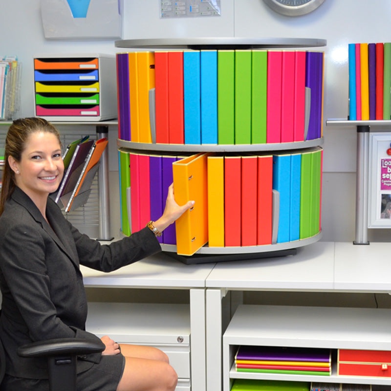 • Each 31 1/2″ diameter tier can hold 44, 2″ wide binders