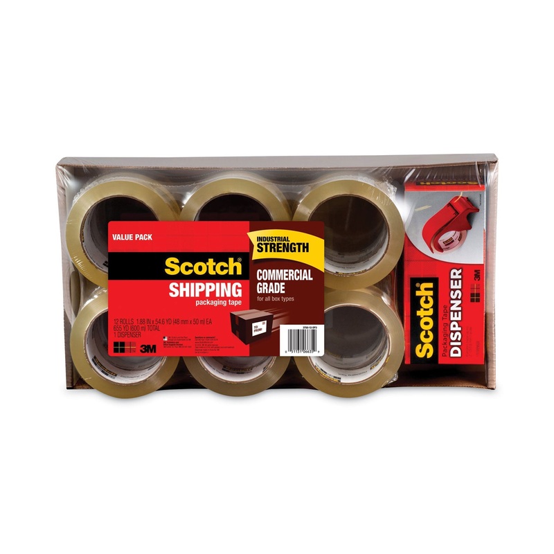 Mailroom professionals need the super strong, reliable seal of Scotch Commercial Grade Shipping Packaging Tape. Heavy duty, hot melt, solvent free adhesive combined with polypropylene backing keeps out moisture, dust and dirt and assures reliable closures. Designed for industrial use, one strip at a time instead of many layers seals your package securely. Resistance to splitting and slivering saves time, while a release coating makes unwind easy. Tough jobs demand the right tools. For packaging boxes, Scotch Commercial Grade Shipping Packaging Tape is the best tool for jobs that demand heavy duty performance. Premium Value PackIncludes Scotch DP300 handheld packaging tape dispenser. Grade: Heavy-Duty; Core Size: 3″; Dispenser Included: Yes; Adhesive Material: Hot Melt Synthetic Rubber.