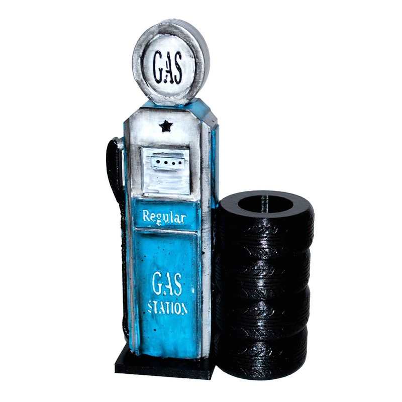 3D Printed Old Fashioned Gas Pump Pen HolderExperience the nostalgia of a bygone era with our unique Old Fashioned Gas Pump Pen Holder. This hand-painted piece, created by the talented John U, features a classic gas pump and a stack of 4 tires. Its 3D prin