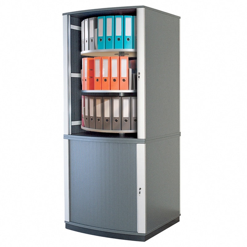 Store your binders in half the space with our 5-Tier binder carousels. Precision-crafted in Germany, these cabinets enable document sot be stored securely and safe from unauthorized access making them HIPAA compliant. The lockable sliding tambour doors glide easily and quietly retract into the cabinet walls without taking up additional floor space. The independently rotating tiers of a Deluxe Carousel within these cabinets offer the benefits of binder filing, plus the security of a locking cabinet.