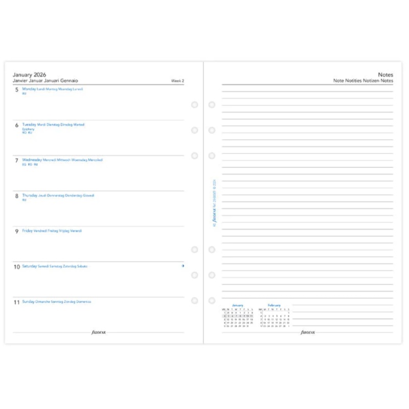 Organize your week in detail with this A5 week on one page diary with facing notes.Multilanguage: English, French, German, Dutch & Italian80gsm white fountain pen friendly papercompatible with Filofax A5 size Organizers & Clipbook