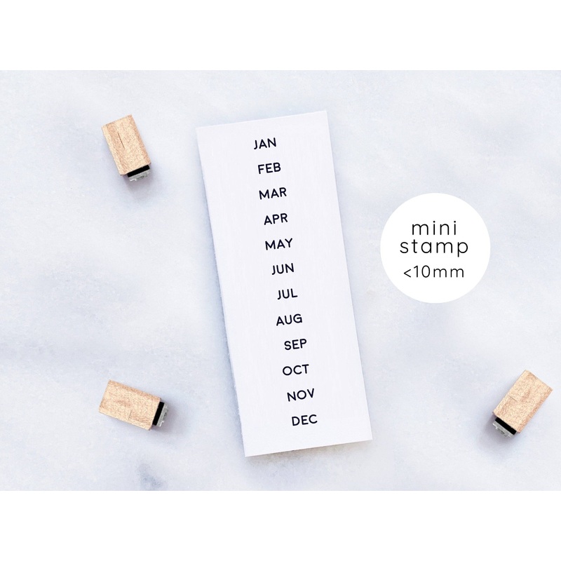 ABBREVIATED CALENDAR MONTHS STAMP SET (MINI)One set of 12 mini rubber stamps with tiny abbreviated months of the year perfect for journaling, bullet journals, planners, agendas, to do lists, and other crafty projects!Note that these are tiny stamps measuri