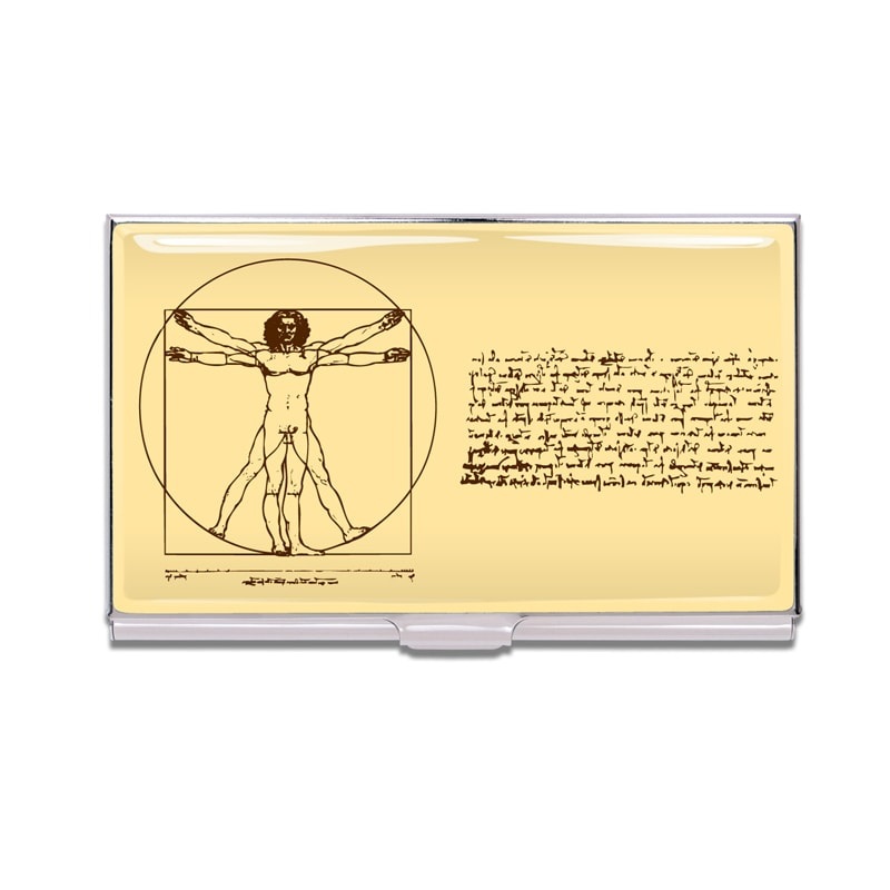 ACME Studio card cases have mirror chrome metal finish inside and out with a unique epoxy image applied to the lid. ACME”s logo is stamped on the back. Card cases hold 12-14 business cards, or 2-3 credit cards. “Science” Business Card Case is a design by Leonardo Da Vinci, from Acme Studios, USA.