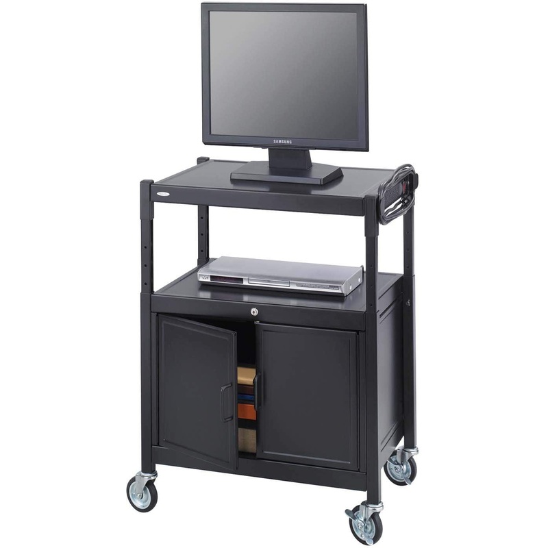 Sturdy, transitional, and compact, the Safco Steel Adjustable Cart with Cabinet can hold up to twenty-inch monitors and securely store media components in a locking cabinet. In addition, it comes with an outlet UL-approved mini surge protector with a power