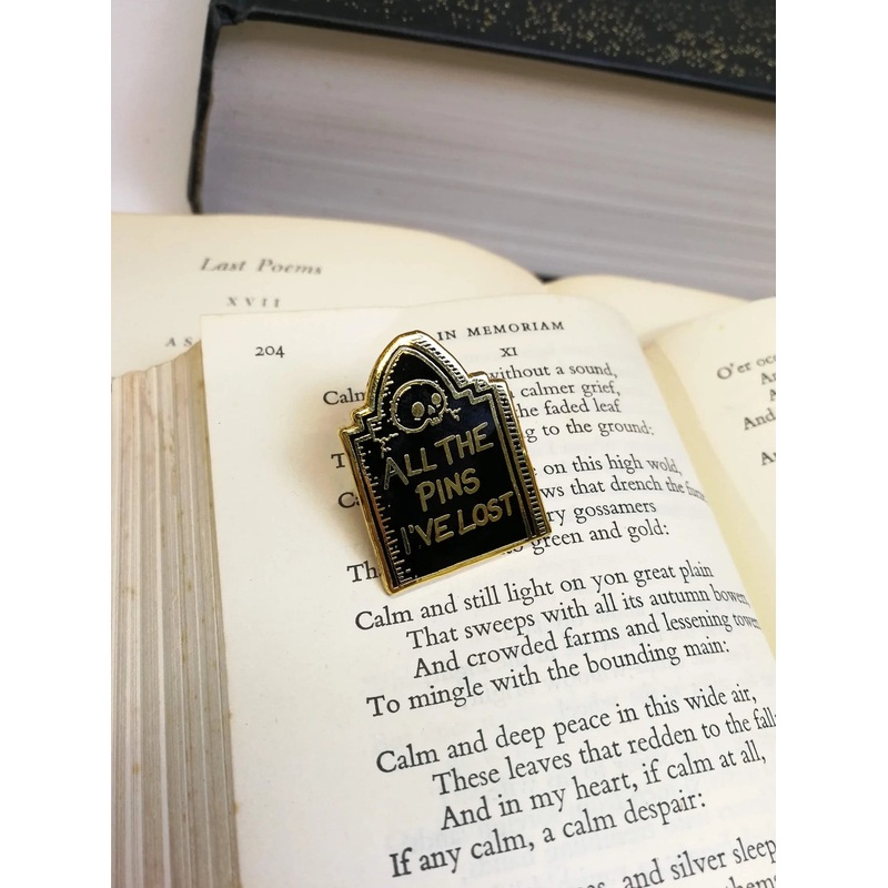 In memoriam of all the pins that have fallen from lapels or pinged off of backpacks, never to be seen again (but forever in our hearts).// Measures approx 25mm tall // Rubber clutch to the reverse// Mounted to a spooky backing card