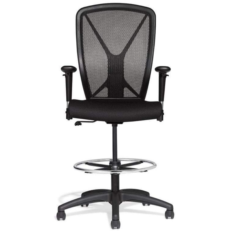Other features on this office drafting chair include an elastomeric mesh fiber backrest that helps prevent premature stretching while distributing body pressure evenly for maximized air circulation, one-touch pneumatic seat height adjustment, chrome finish foot-rest, optional height-adjustable armrests available for a minimal charge, and a heavy-duty five-star nylon base with dual wheel carpet casters standard. This drafting chair is rated for users up to 350 lbs. Meets or exceeds ANSI/BIFMA standards.