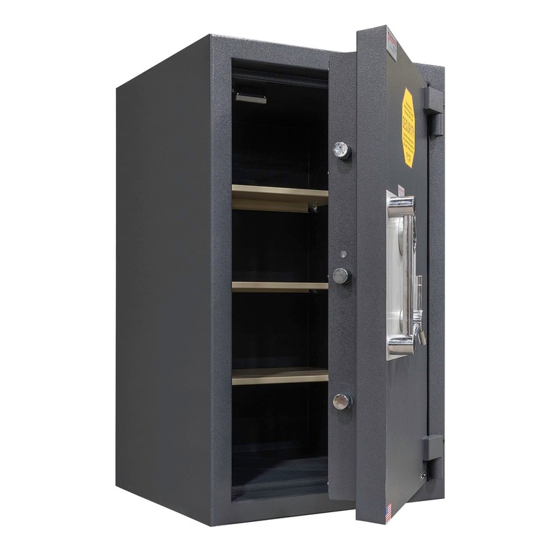 • Equipped with a U.L. listed Group II key changeable combination lock. The lock is protected by a massive drill shattering hard plate and two additional springloaded devices.