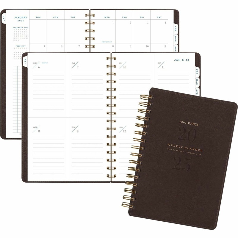 Part of the At-A-Glance Signature Collection, this stylish planner features a soft, brown leatherlike cover with stitched edges and bronze accents for a polished look. High-quality paper features superior ink bleed-resistance. Planning pages range 13 month