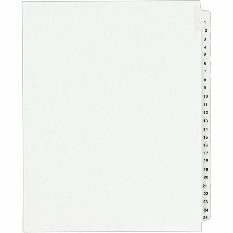 Dividers are ideal for index briefs, legal exhibits, mortgage documentation files and more. White paper stock features clear RipProof reinforced side tabs that are printed on both sides in Avery Style (Helvetica bold type). Binding edge is unpunched so indexes can fit any binding system.