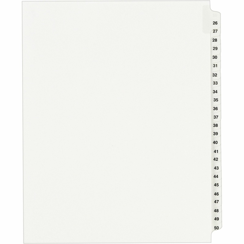 Dividers are ideal for index briefs, legal exhibits, mortgage documentation files and more. White paper stock features clear RipProof reinforced side tabs that are printed on both sides in Avery Style (Helvetica bold type). Binding edge is unpunched so ind