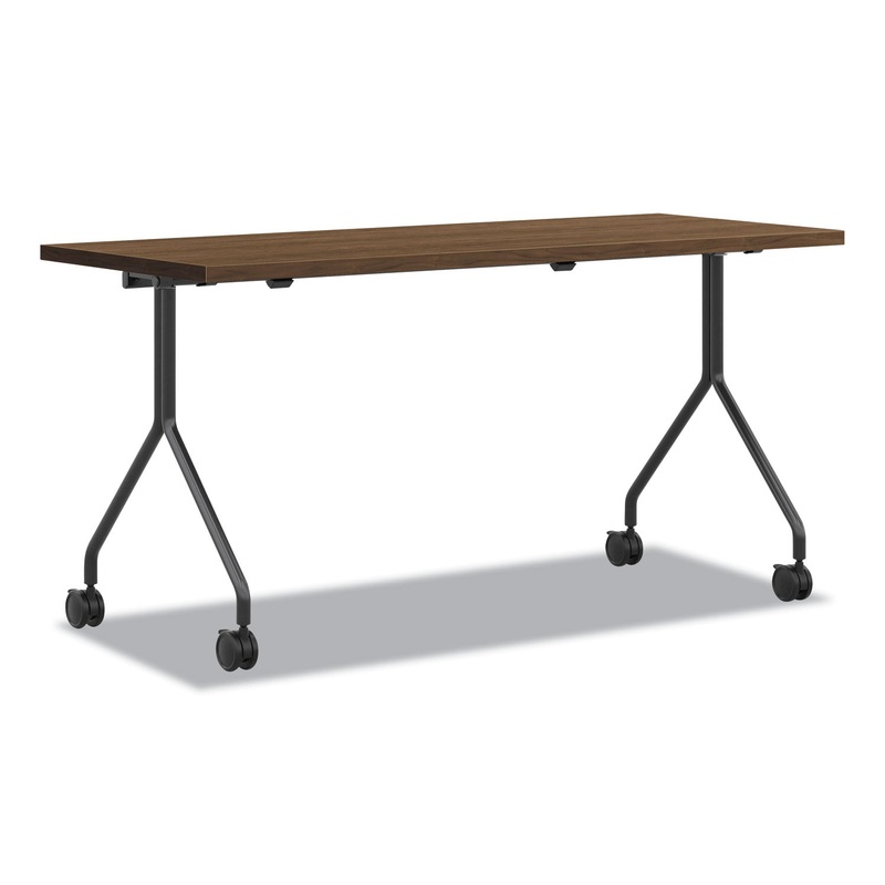 Selection of mobile and nesting tables to support meetings and collaborative work. Base flips the worksurface vertically to nest with other tables to save space. Table and base are bundled together. Scratch-, spill- and stain-resistant laminate stands up to heavy use. Rectangle worksurface gives up to four people space to collaborate. Order one SKU, get both. Top Color: Pinnacle; Color Family: Walnut; Base Color: Black; Top Shape: Rectangular.