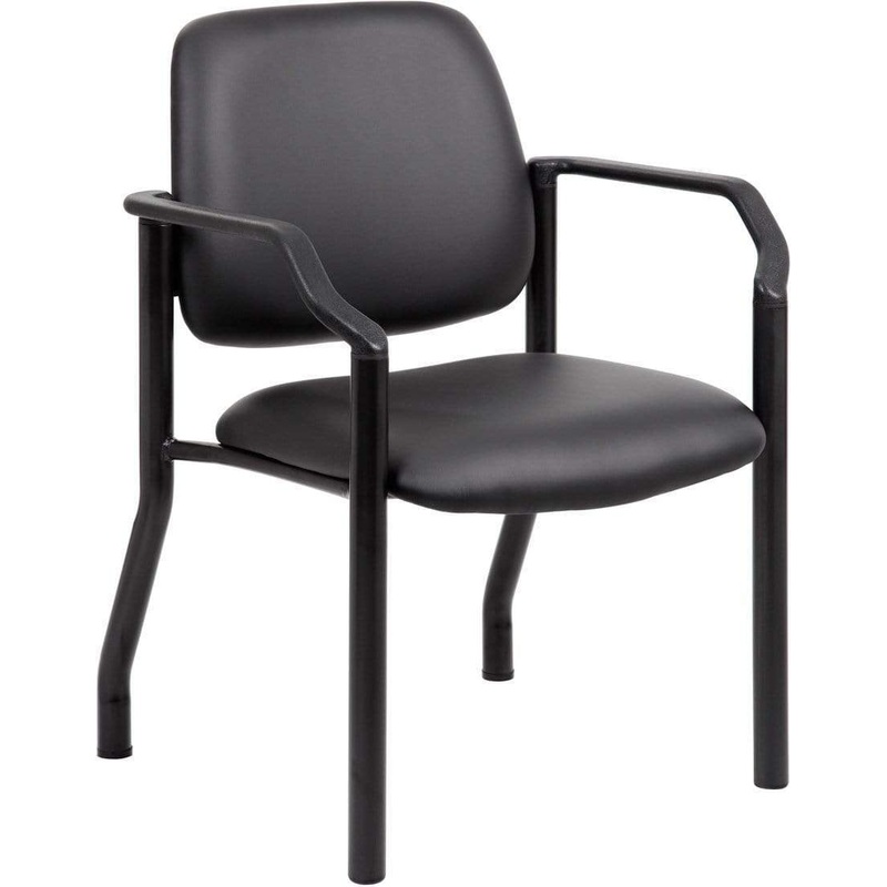 This heavy-duty, comfortable mid-back guest chair is perfect for anyone seeking additional seating in any room or office. The guest chair is designed with a strong and easy-to-clean antimicrobial black vinyl material that lends a professional appearance, along with a sturdy four-leg tubular black steel base that offers coziness and strength. The chair stands at a fixed height with a strong fixed arm design. It boasts a weight capacity of 300 or 500 lbs for your bariatric waiting room chair needs.