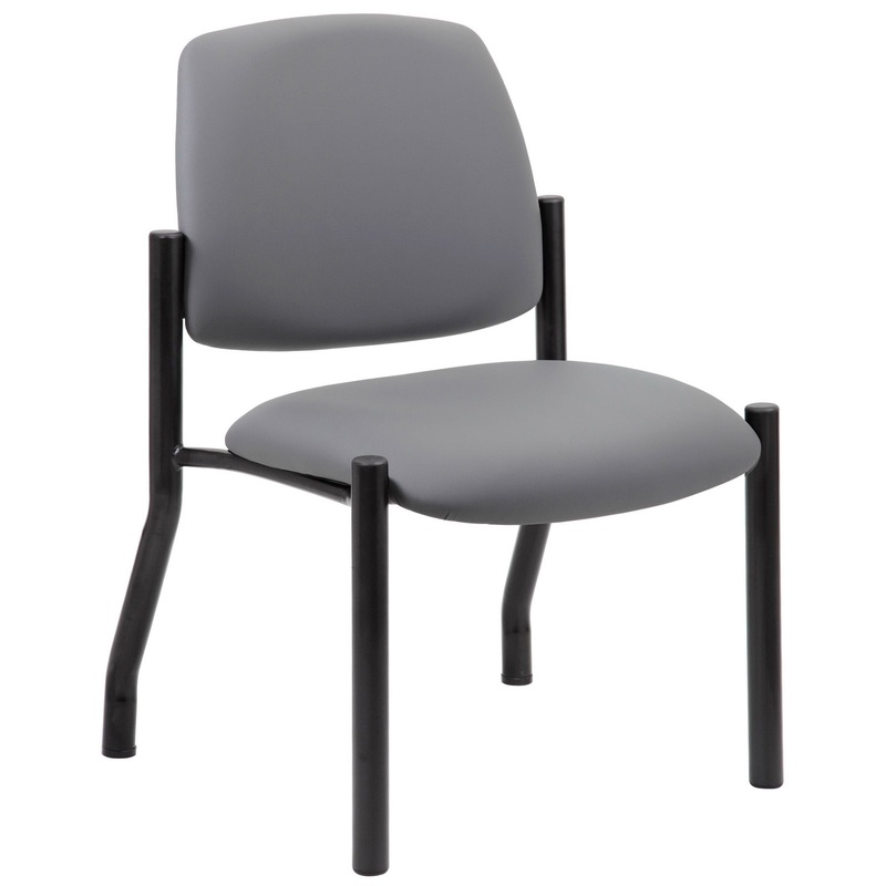 This heavy duty and comfortable mid back guest chair is perfect for anyone seeking additional seating in any room or office. The guest chair is designed with a strong and easy-to-clean grey antimicrobial vinyl material that lends a professional appearance and a sturdy four-leg tubular black steel base that offers coziness and strength. The chair stands at a fixed height with a streamlined armless design and boasts a weight capacity of 300 lbs.