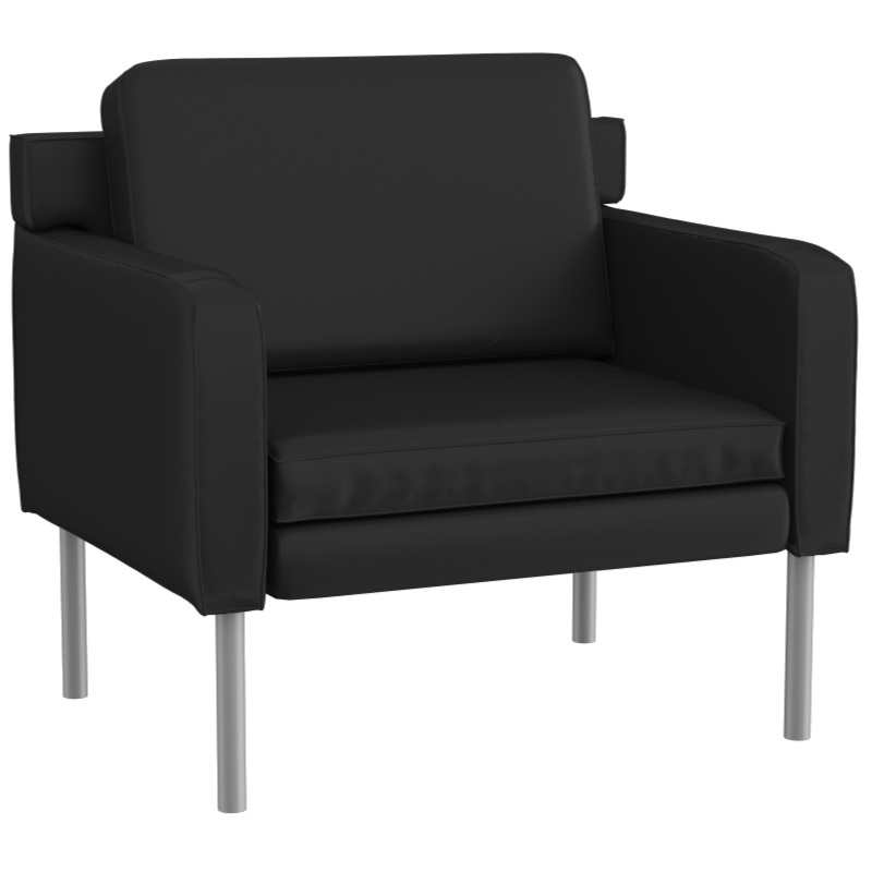 This upholstered lounge chair is perfect for waiting rooms or the modern living room. It is upholstered in a soft-touch antimicrobial vinyl. This guest chair is designed with clean lines and fixed box arms. Ithas a deep, thick cushion that allows you to sink in and relax.The sleek black steel legs with plastic levelers at the bottom provide not just style, but stability. This modern guest chair, with its sturdiness and comfort, is ideal for any guest at work or home.