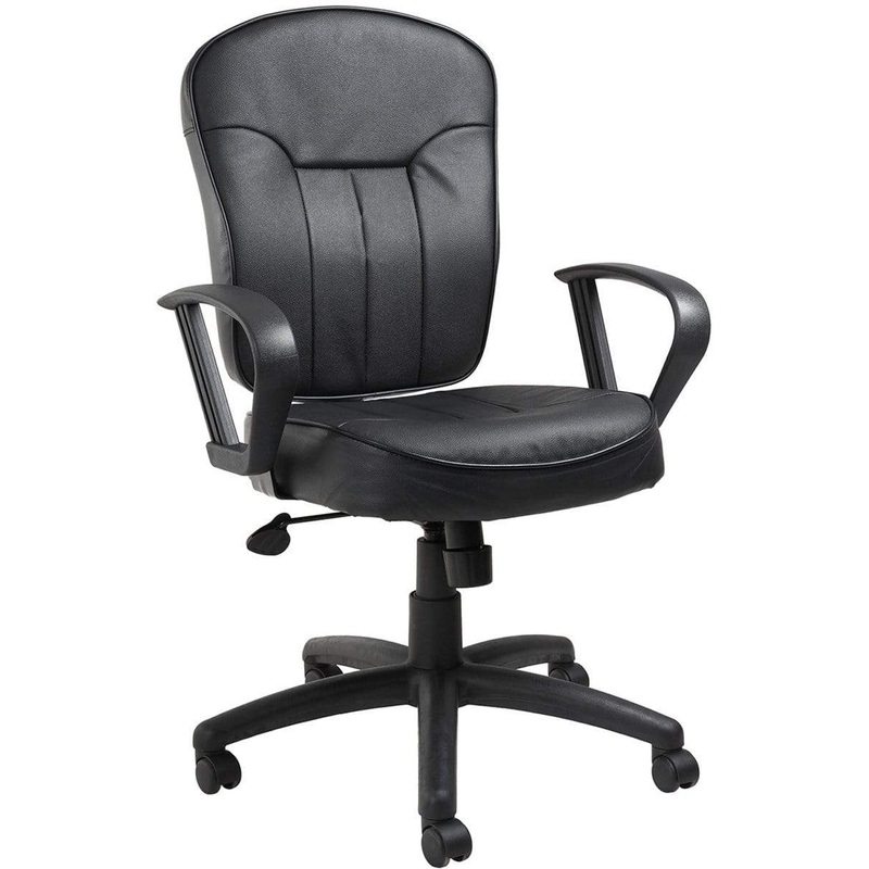 This mid-back leather task chair with extra-large seat and back cushions provides comfort during extended periods of work. The beautifully upholstered Black LeatherPlus (leather and polyurethane) provides extra softness and durability. The Loop Arms make for comfortable and natural armrests. The large 27 black nylon base provides added stability to the chair by spreading the load over a larger surface area. The hooded double wheel casters make it easy to move and shift directions.