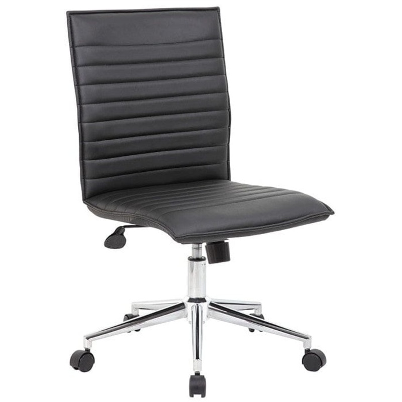 Introducing the Boss Black Vinyl Armless Hospitality Chair [B9534C-BK], designed to elevate any room or office with its sleek ribbed black vinyl design. Equipped with a sturdy chrome 25" base and 2" nylon dual wheel casters, this chair adds a touch of meta