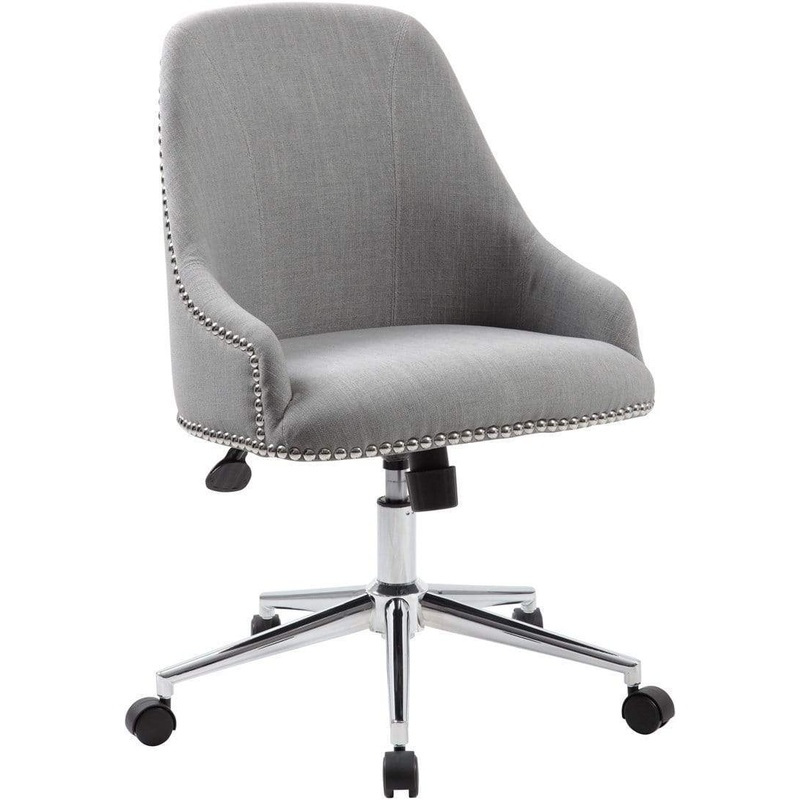 The Carnegie desk chair in grey is made from quality linen and features a gorgeous design utilizing nail head trim. It boasts a strong, sturdy high crown chair base in chrome with 2 inch nylon dual wheel casters for a smooth roll and the chair has a weight
