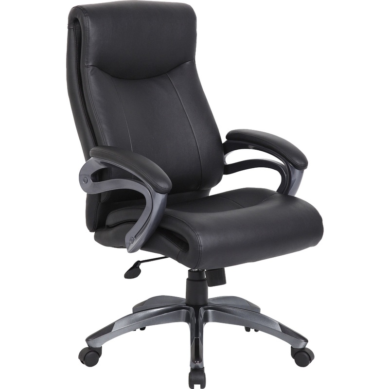 This high back executive chair from Boss Office Products features a double layer of padding on the seat and backrest for added comfort. Other features include thick foam filled cushions, durable yet soft LeatherPlus upholstery, contemporary padded loop arms, pneumatic seat height adjustment, tilt with upright tilt lock, adjustable tilt tension control, 360 degree swivel, rich pewter finish on arms and base frame, and a heavy duty five star base with anti-scuff tips and dual wheel carpet casters. Meets or exceeds ANSI/BIFMA standards.