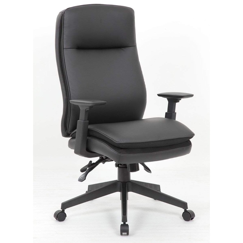 This Caressoft high back executive chair brings comfort and stability to any office environment. It features beautiful and durable Caressoft upholstery and high-back styling with exemplary lumbar support. Adjustable height arms. In addition, the chair has pneumatic gas lift seat height adjustment, an adjustable tilt tension control, a spring tilt mechanism, and locks in the upright position. Its large 27 5 star nylon base provides stability while affording plenty of mobility thanks to its five hooded double wheel casters.