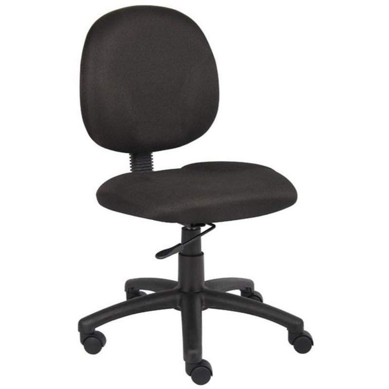This office task chair from Boss Office Products features a contoured seat and backrest that provides support and helps relieve back strain throughout the work day. Other features include thickly padded and generously sized seat and backrest cushions, pneumatic seat height adjustment, 360-degree swivel, available in your choice of black commercial grade fabric or caressoft vinyl upholstery and a heavy duty five star nylon base with dual wheel casters. Optional adjustable arms can be added for a minimal charge.