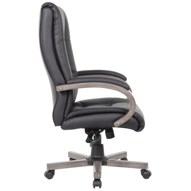 Our high-back executive chair showcases a beautiful, classic wood design and is elegantly upholstered in breathable Caressoft material. It features plush Dacron-filled top cushions with perforated centers, and it is available in cherry, mahogany, or grey wood finishes. The chair is equipped with a heavy-duty dual paddle spring tilt mechanism with an infinite lock for customizable positioning. Additionally, there is adjustable tilt tension control and pneumatic gas lift for seat height adjustment. All of this is supported by a sturdy 27-inch nylon base with five hooded double-wheel casters for optimal mobility.