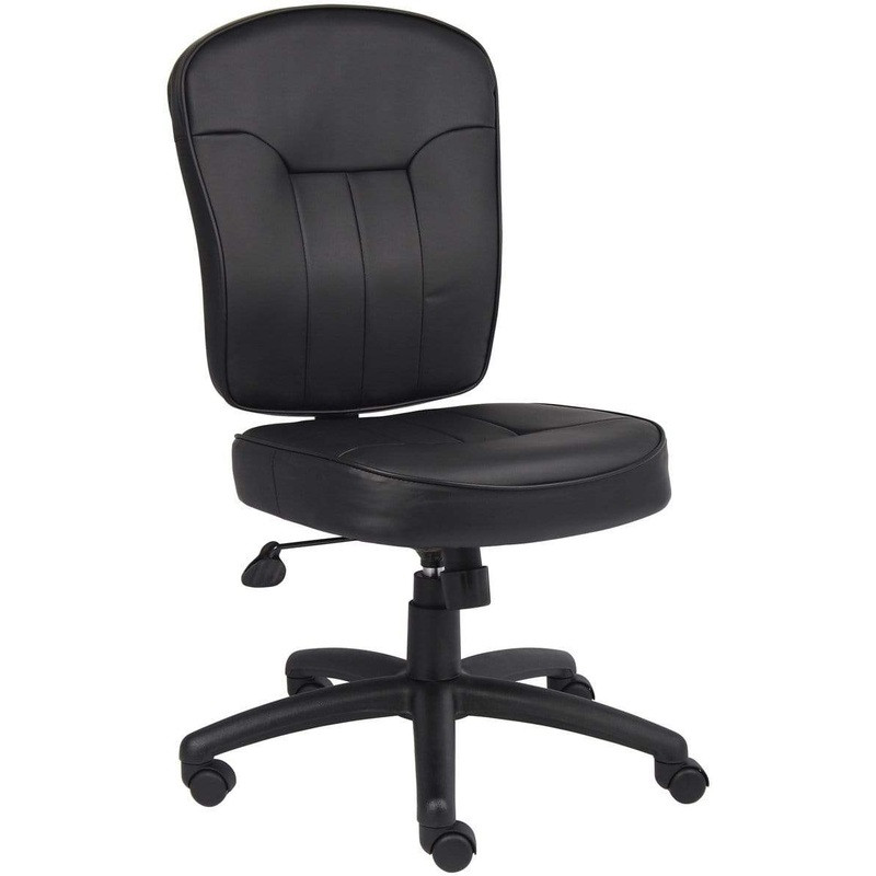 This black leather task chair is designed for comfort, featuring extra-large, plush seat and back cushions. It is luxuriously upholstered in LeatherPlus, a durable leather infused with polyurethane for enhanced softness and longevity. The chair includes a