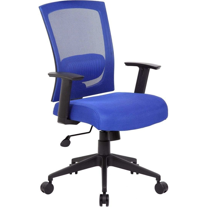 Our mesh back task chair provides comfort and ergonomic support for any office environment. It features ratchet back height adjustment, two adjustable height armrests, a pneumatic gas lift seat for easy height adjustment, and adjustable tilt tension control. Its versatility is augmented by a blue mesh back with lumbar support and a breathable blue mesh fabric seat. All of this is supported by a 25 black nylon high crown base and five hooded double wheel casters.