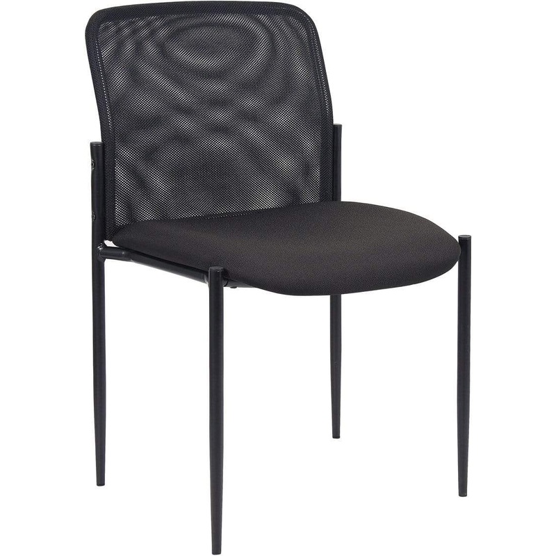 This black mesh guest chair is an ideal addition to any office or room. When not in use, the chair can be stacked up to 4 high and easily stored away, making it perfect for smaller spaces. It features a fixed height and fixed arms, along with a mesh seat and an airy, breathable mesh back. With a weight limit of 275 lbs, this chair is both sturdy and comfortable. Additionally, its sleek black design adds a modern and professional touch to any space.