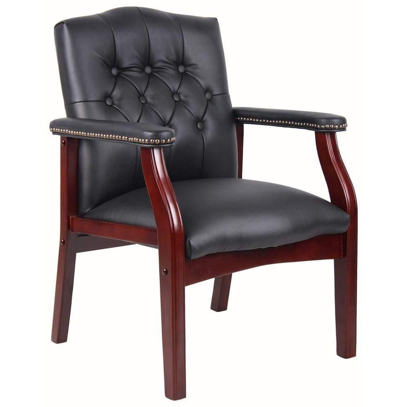 This elegant visitor's chair showcases a luxurious oxblood burgundy or deep black vinyl upholstery, designed to enhance the aesthetic of your office environment. The seat and backrest are generously cushioned, ensuring exceptional comfort for your guests d