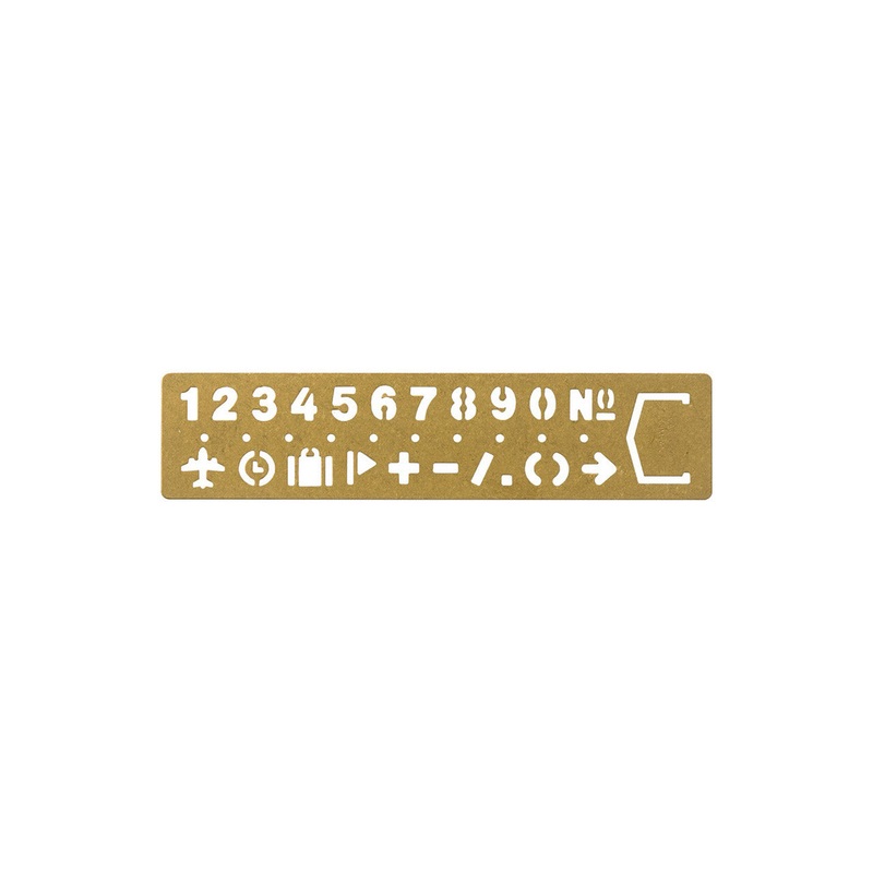 Its main feature is as a template to write a label, name or title clearly and neatly. A transparent coating on the template avoids staining of paper/card surfaces by the plain brass, which has its own tone.