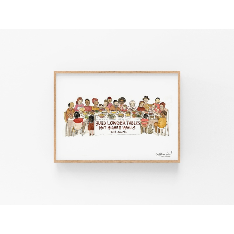 Build Longer Tables Not Higher Walls Quote by Jos AndrsThis print is a 9"x12" digital reproduction of an original watercolor + pen and ink illustration.It is printed on 100 lb EcoSilk Paper with soy-based inks. Ships flat with white acid-free board in a pl