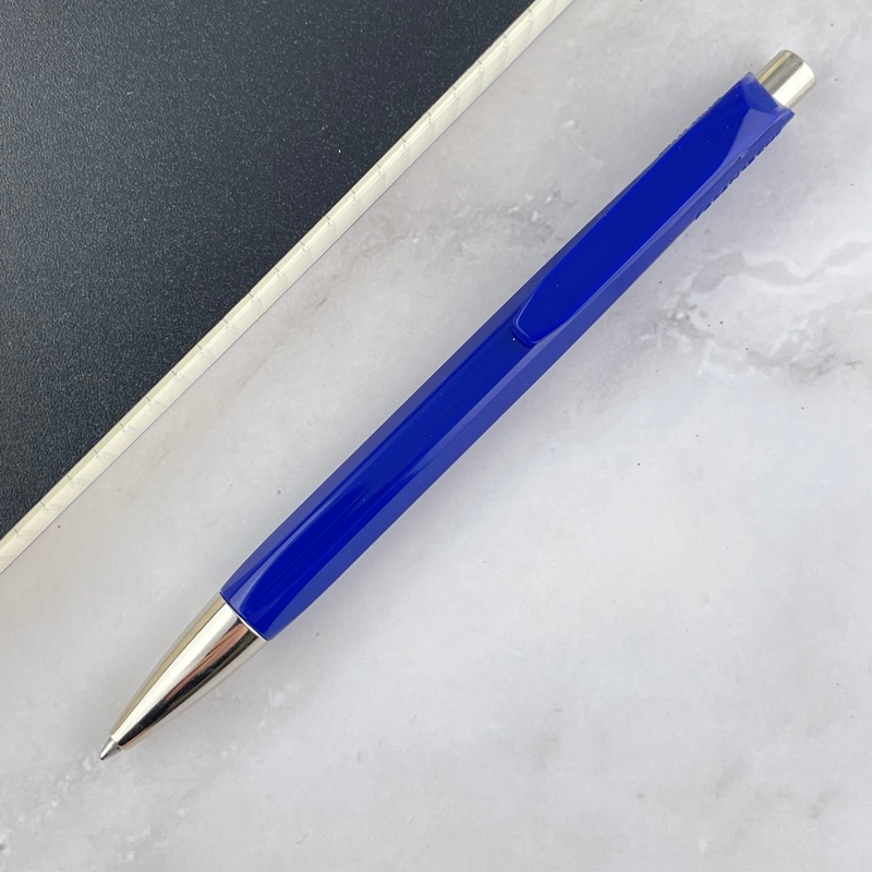Comes equipped with a blue ballpoint refill.
