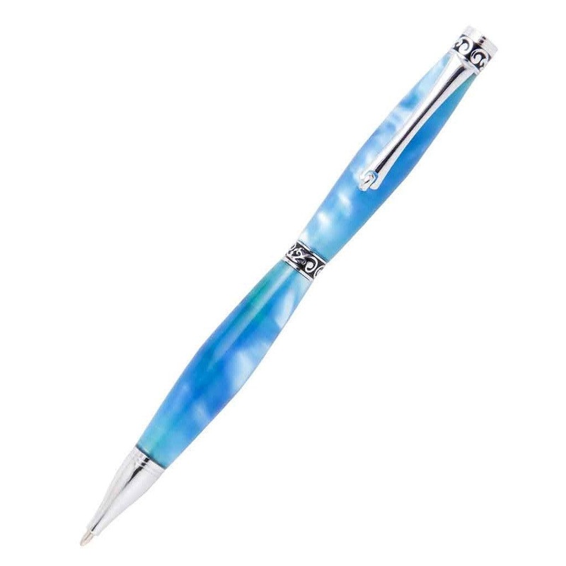 The Chic-Line V2 pen kits now feature a new and improved decorative center band. If you appreciate the simplicity and understated elegance of the best-selling Slimline pen, the Chic-Line pen kit is a must-have. This chic slim twist pen boasts a classic scrolling fretwork design on the pen end and a stylish rotating wheel on the pen clip.