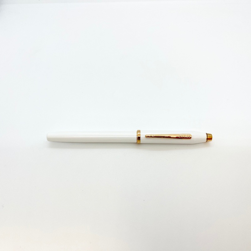 This iconic Cross rollerball pen has a bolder look and wider girth than the original century. It's balanced to precision and weighted for a tactile writing experience in signature Cross style.Pearlescent white lacquer with plashed rose-gold PVD appointment
