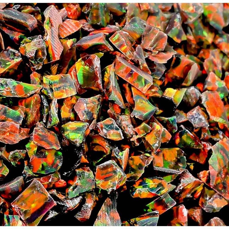 Crushed Opal - Black FireThis Crushed Opal is a synthetic lab-made or cultured opal. Natural opal can crack and craze over time. But the polymers in the cultured opal make it much more stable, workable, and economical than natural opal. The magical brillia