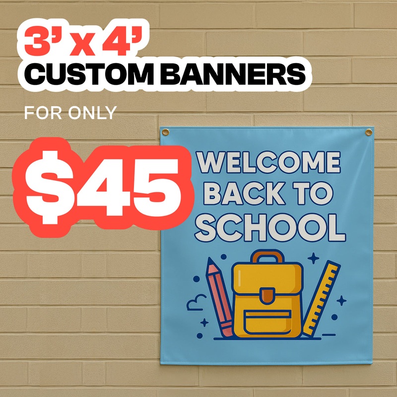 For a limited time get a 3’x4′ custom banner for $45.00 normally priced at $60.00 — A savings of over 25%.