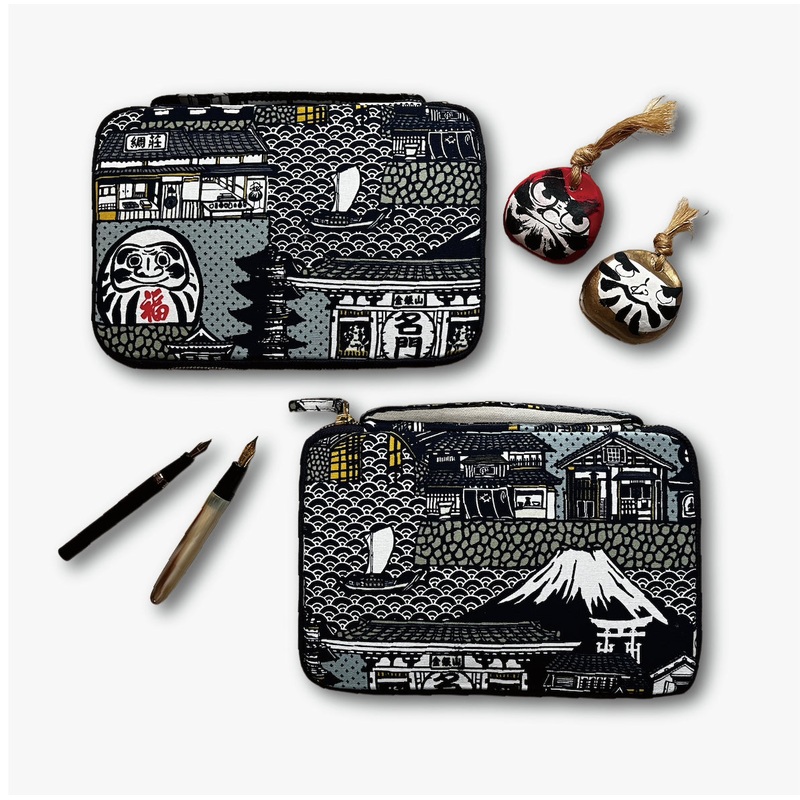 This Japanese Daruma-style portable fountain pen case features distinct patterns on each side, making it an ideal choice for writing enthusiasts.Thoughtfully designed with premium fabrics and Japanese aesthetics, it reflects refined taste and a unique styl