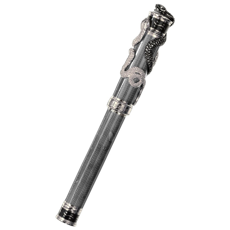 David Oscarson Black Water Snake Rollerball Pen – Translucent Grey and Opaque Black Hard Enamel. The Black Water Snake series is the twentieth David Oscarson limited edition pens, available in three primary colors. The writing instruments are limited to 88 pieces (including fountain pen and rollerball pen). Snake represents rebirth in Chinese mythology. Snake also symbolizes beauty, wisdom, esoteric knowledge and spiritual discovery. The Chinese Snake represents turmoil and transformation as well as opportunity and enthusiasm. The year 2013 was considered to be snake year and also black water year according to the Chinese Astrology Five Element System. The writing instruments come in .925 sterling silver, incorporating multiple levels of diamond-cut guilloche engraving and a combination of translucent and opaque hard enamels. The pen cap is gloriously decorated with Snake inlaid in opaque black hard enamel and water repeats horizontally in high relief around the top of the cap and bottom of the barrel. Great looking rollerball pen with exceptional writing experience.