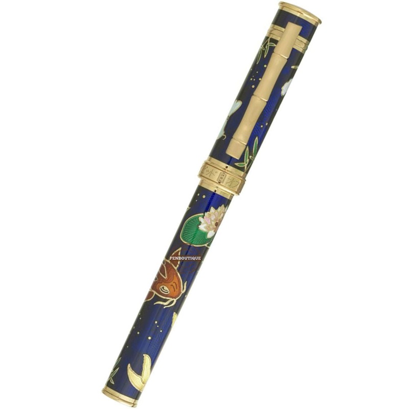 Sapphire blue decoration on David Oscarson Koi Rollerball Pen uniquely features several bamboo leaves and water lily all in high and low relief (the bamboo motif is also repeated on the gripping section and clip). Multiple circles representing bubbles and