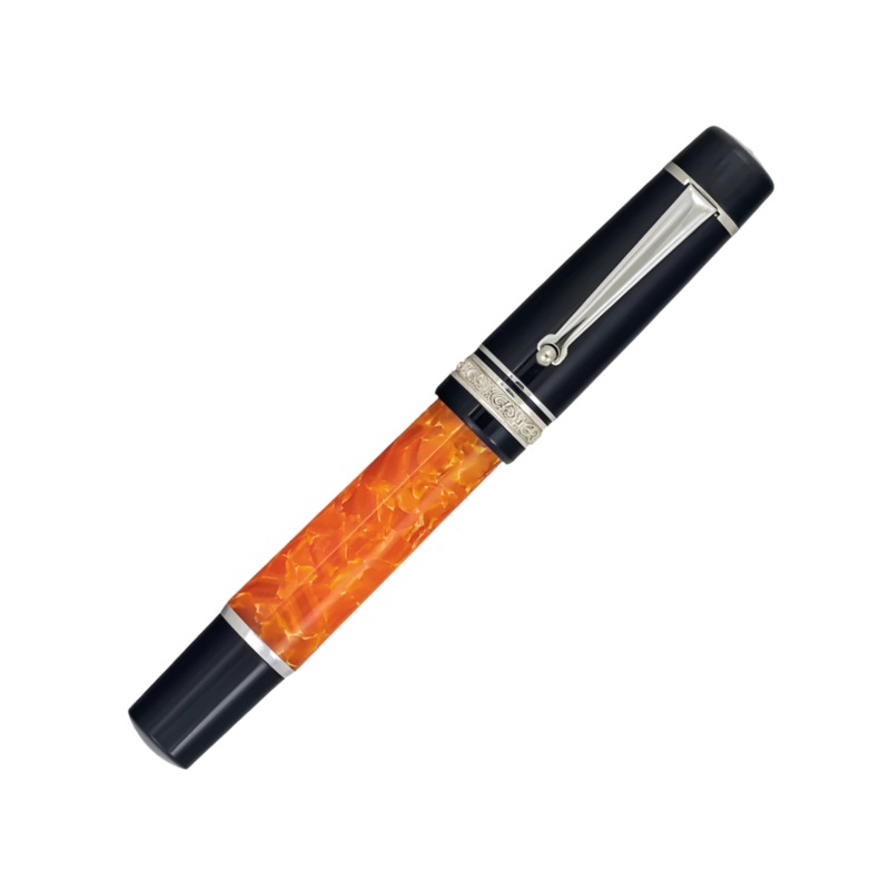 This classic Delta DV Original Oversize Rollerball has a commanding presence. It showcases the striking orange and black resin blend inspired by the original Dolce Vita design, complimented by 24k gold-plated trims. The vivid orange barrel provides a captivating contrast against the black resin cap and end. The design incorporates a threaded cap and meticulous detailing in the center ring, emblematic of Delta’s meticulous and high-caliber craftsmanship, a hallmark of their design philosophy.