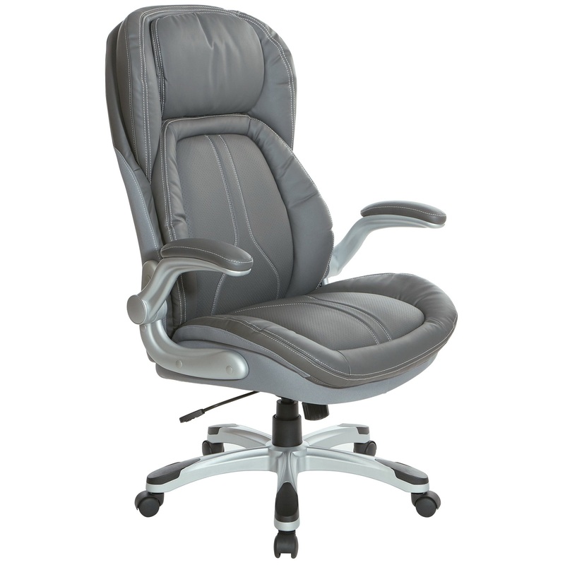 Features:Contoured Seat and Back with Built-in Lumbar SupportOne Touch Pneumatic Seat Height AdjustmentLocking Tilt Control with Adjustable Tilt TensionBlack or Grey Bonded LeatherPadded Adjustable Flip ArmsSilver Nylon Base with Dual Wheel Carpet CastersF