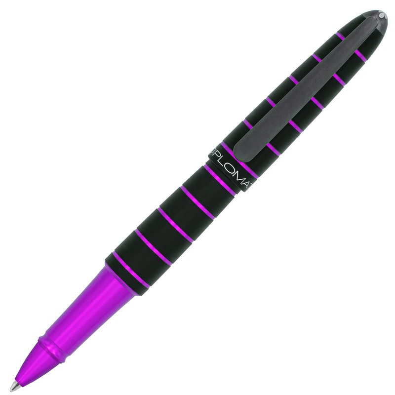 The newly launched Diplomat Elox fountain pen features a Zeppelin-inspired black anodized aluminum body, accented by horizontal rings of anodized purple aluminum. It has a satisfying soft sliding click cap that posts securely onto the barrel when writing.