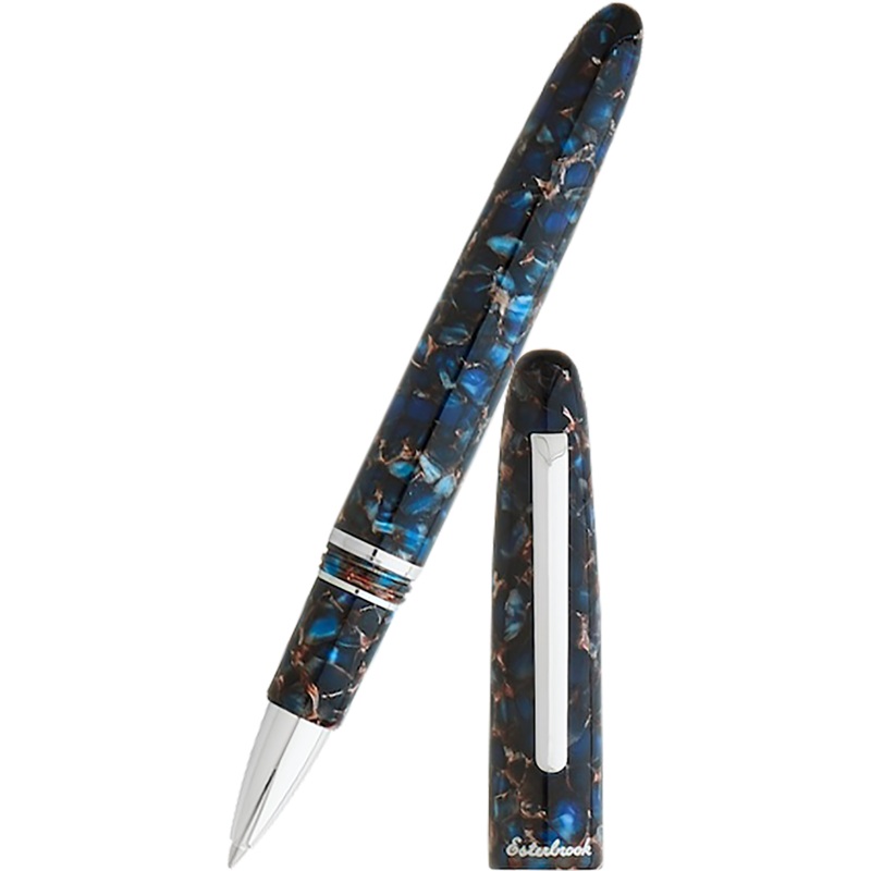 As a part of our Core Range, thecomfortably balanced Estie Nouveau Blue is offered in ballpoint,rollerball, standard and oversized fountain pen models.It is offered in palladiumfinishes.The material is blended and turned acrylic with a Mucha mix of blues and ahighly polishedfinish.