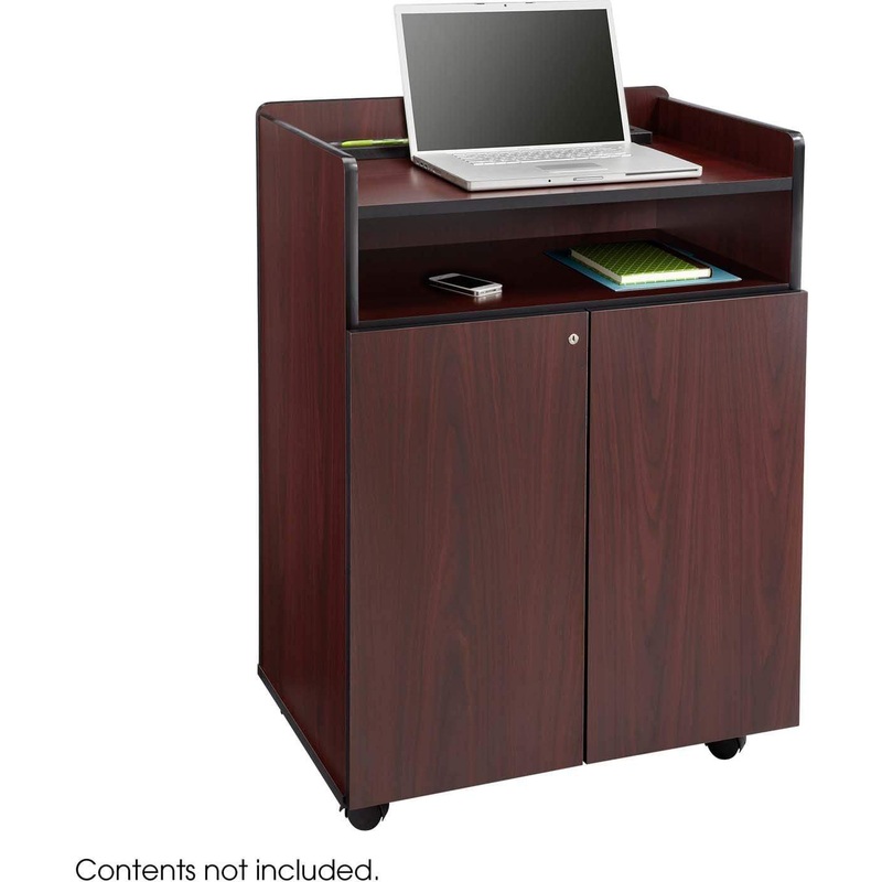 Doubly functional, this presentation aide provides room for beverages and other items, with all types of storage facilitated by the adjustable internal shelf behind a locking cabinet. Four evenly placed wheels and a high-rimmed upper platform keep presentation materials in place within a deep mahogany or cherry finish.